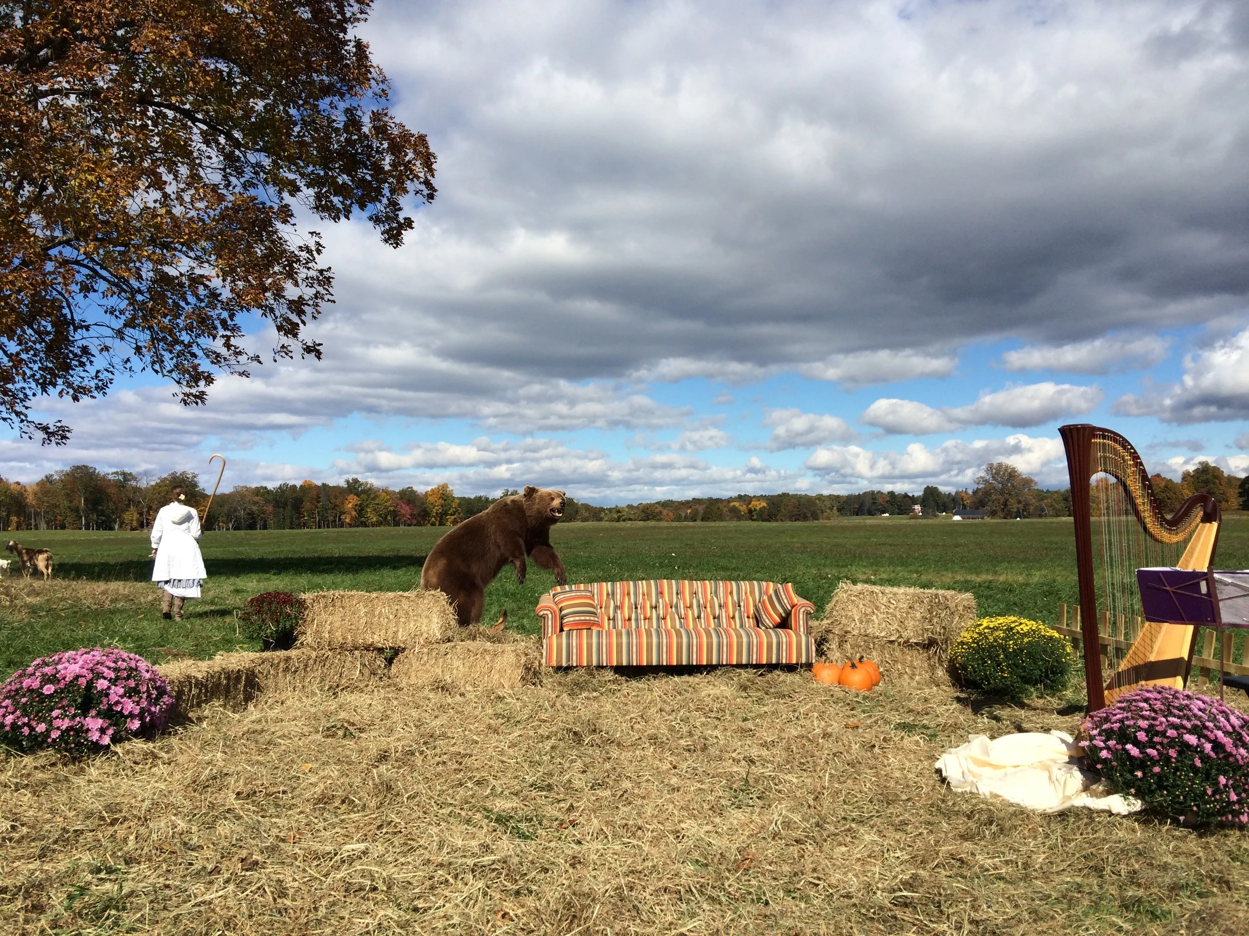 Turns out, I was to be a part of a photobooth backdrop. The guests were bussed out in groups (on a bus that was brightly painted with flowers and looked like it had time-traveled there from the 1960s - I wish I had gotten a picture of it) to find this setting, and me, playing my harp. Not only this, but there were actors around pretending to be members of some tripped-out cult that the guests were being indoctrinated into. I played music, but my purpose there was pretty much to be an oddity for the guests to take pictures with. The wind was really strong, and after having my stand blown over for the third time, the cameraman said "You know, you don't really have to play songs. Just make some sounds and it'll be great." So.... I sat in this strange scene and basically improvised for about six hours. It was a good thing that I stopped trying to play actual songs, because it was not warm out and my fingers became too numb to do much but gliss and do various other extended techniques that I thought might be fun to hear.