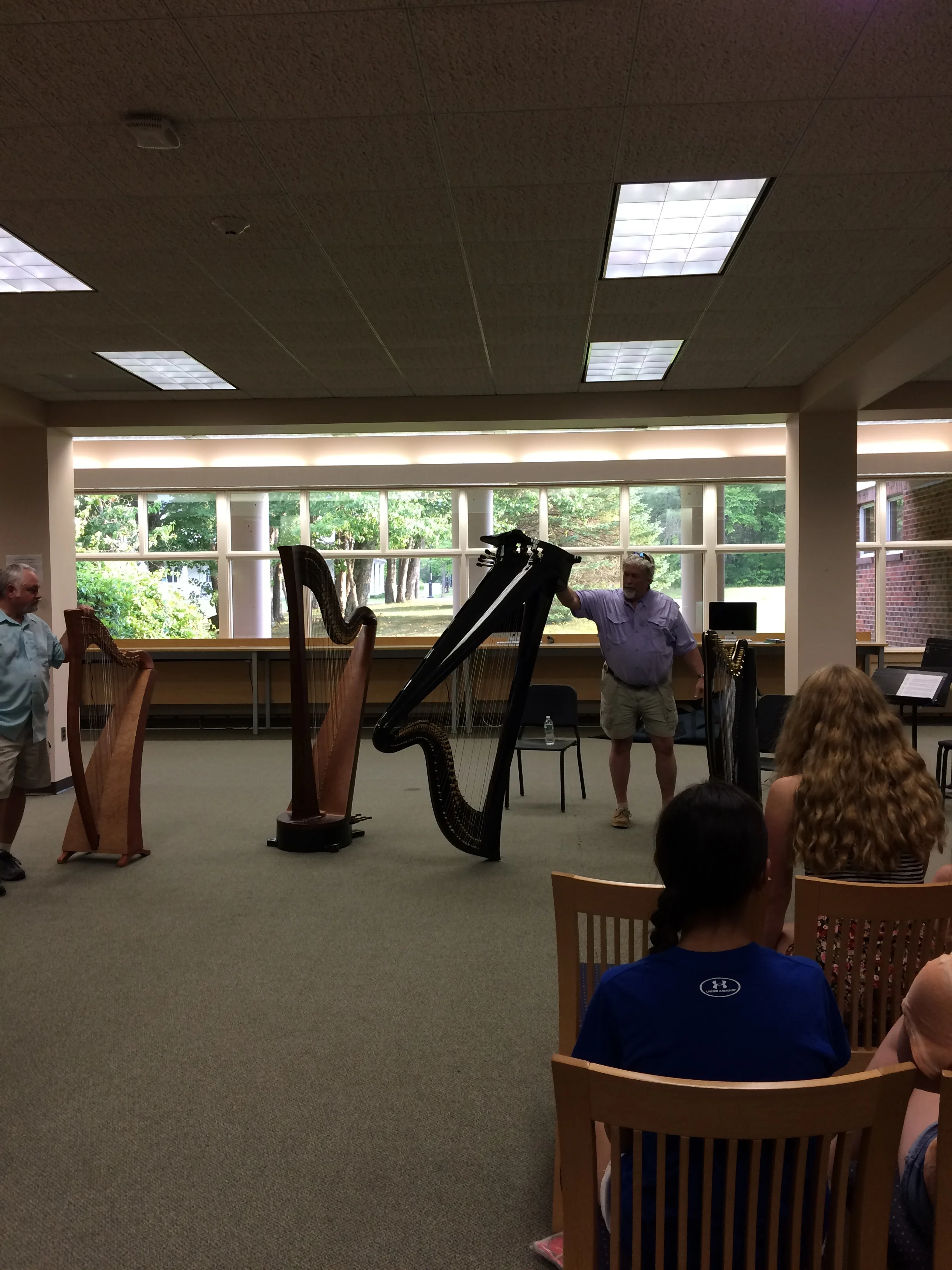We had some exciting guests this year, including the people from Starlight Harps - currently the only makers of all-carbon fiber pedal harps. The kids and I all got to try playing on them. They're super light - less than 40 pounds - so they're very easy to carry. They're also very difficult to damage. It was fun (albeit a little frightening) watching these guys bang on the harps, pour water on them, and even stand them upside down to show how easy they are to move.