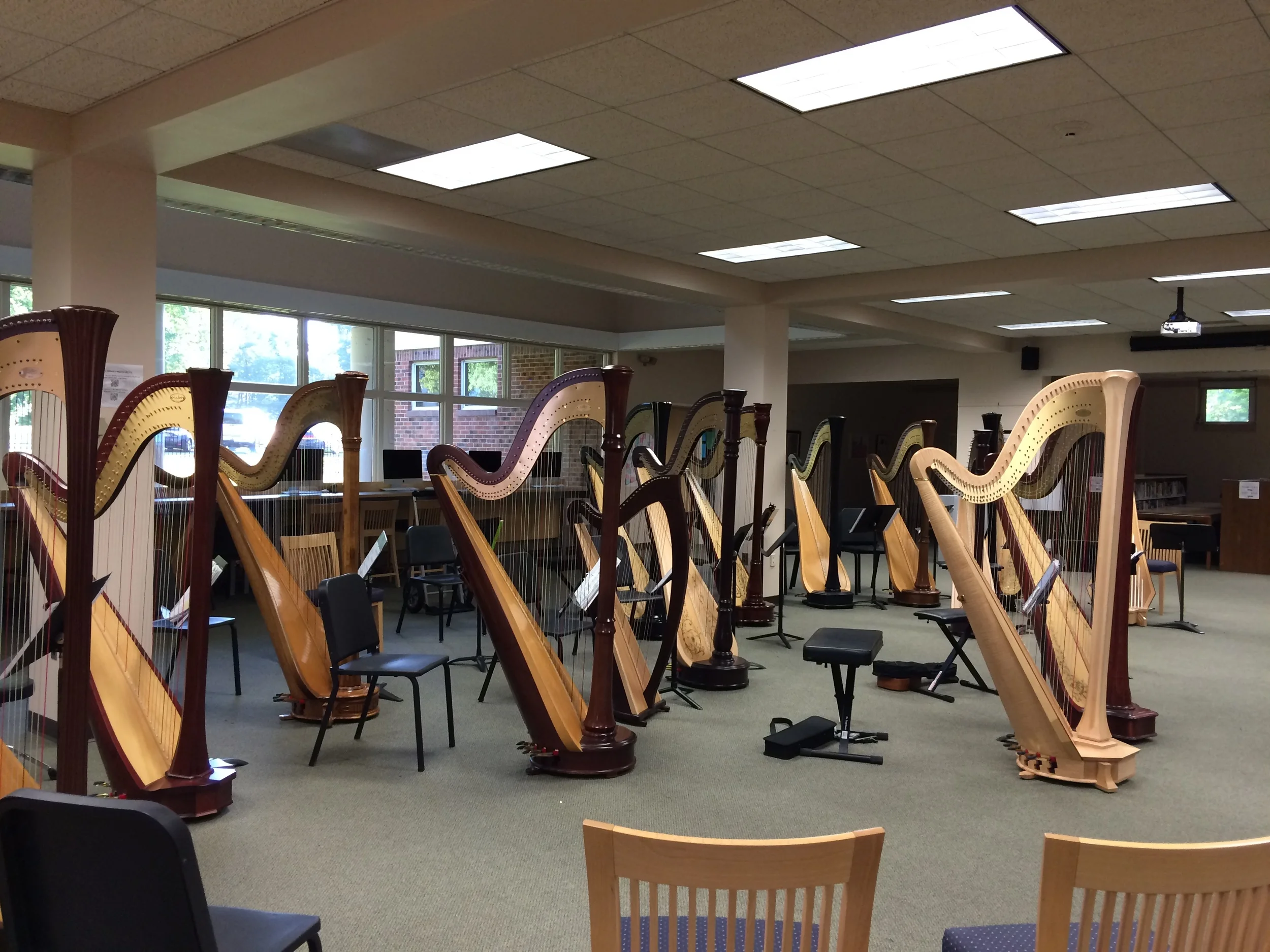 All of the harps in place for Rachel Miller's arrangement of Coldplay's "Fly On"